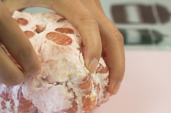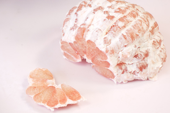 4、顺着刀口将西柚外皮剥掉,同时剥掉里面的白皮。