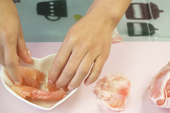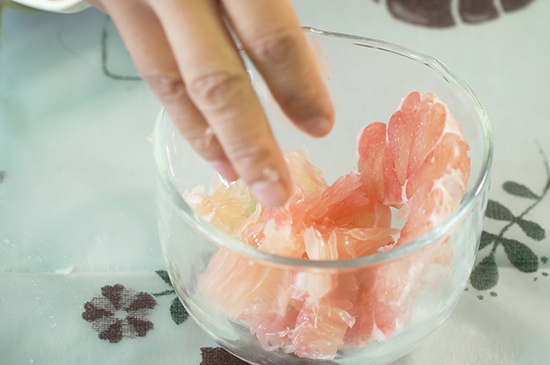 5、剥完外皮和里面白皮后,果肉用白碗装好,这才是西柚的正确打开方式。