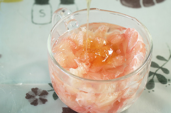 3、滴入适量蜂蜜在西柚果肉上,再略微搅匀蜂蜜。