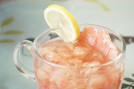 4、玻璃杯口上卡一片柠檬,美味的西柚汁就做好了。