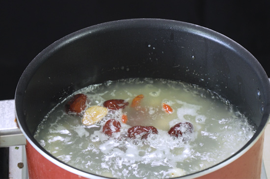 2、在锅中倒入适量的清水,加入大米后大火烧至水开,然后加入洗净备用的红枣、莲子、枸杞等食材,加入过程中不断的搅拌均匀。