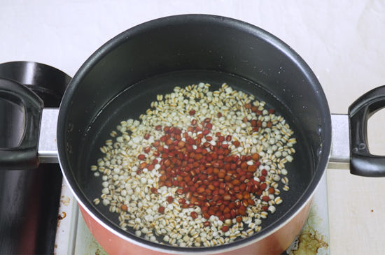 1、提前将洗净的薏米和红豆用冷水浸泡20分钟,再捞出备用。