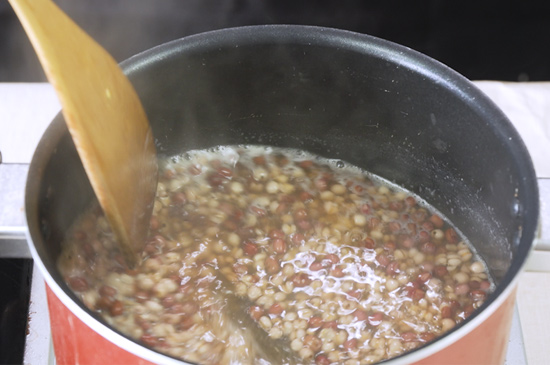 2、在锅中倒入适量的清水,加入薏米和红豆盖上锅盖,用大火烧开后用小火继续熬煮半个小时左右。