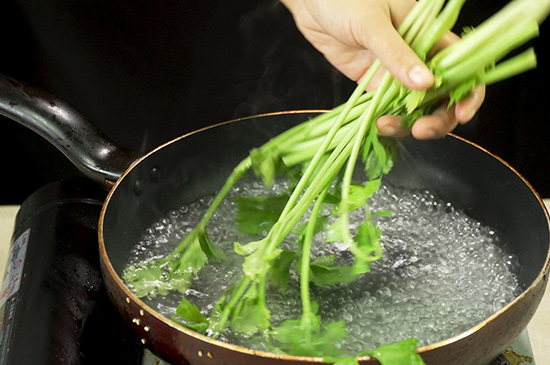 2、起锅烧水,芹菜洗净后焯水片刻,再捞出切末备用。