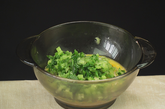 3、肉泥放入盆内,加入蛋液、香油、芹菜、葱花从一个方向搅拌均匀,香喷喷的芹菜饺子馅就做好了。