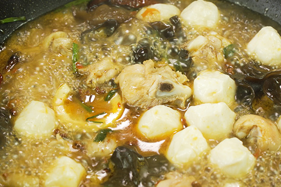 5、最后加入鱼丸、黑木耳、苦菊转小火慢炖至肉熟,美味的火锅鸡就做好了。