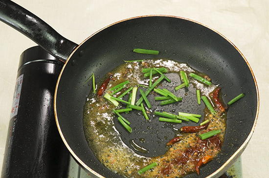3、起锅烧油,油热后放入花椒、辣酱和干辣椒炒出红油,再加入葱和姜炒出香味。