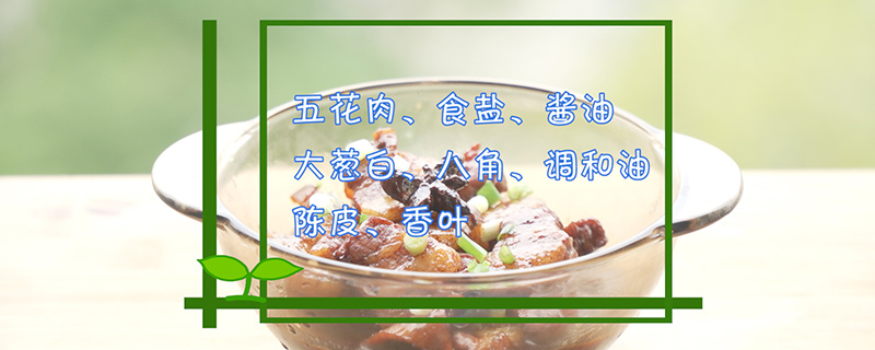 准备食材:五花肉、食盐、酱油、大葱白、八角、调和油、陈皮、香叶。