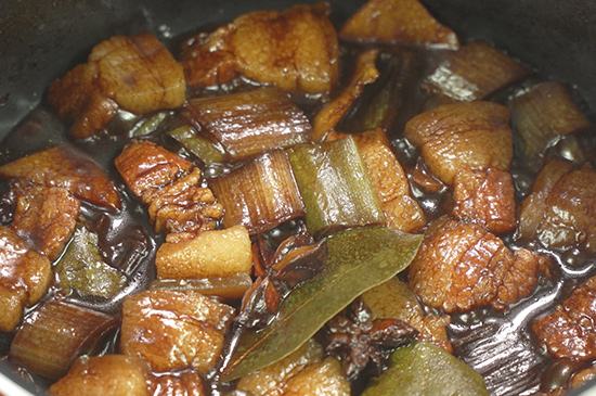 将切好的五花肉,八角、香叶和陈皮一起倒入锅内,调入适量油和盐后放入葱段,再加入适量酱油和水。最后盖锅炖至五花肉软烂,再关火焖制片刻,美味的炖肉就完成了。