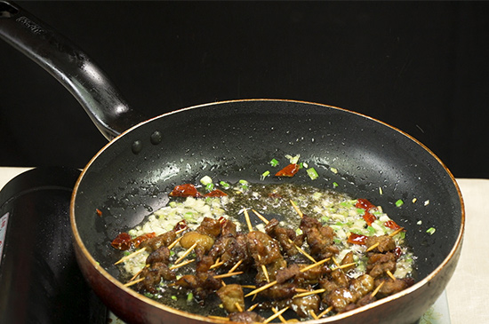 4、往锅内放入干辣椒、葱、蒜炒出香味后,放入肉串快速翻炒,最后撒上白芝麻,美味的牙签肉就做好了。