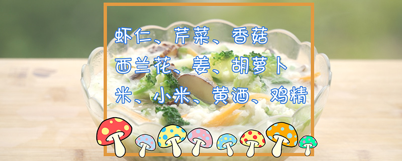 准备食材:虾仁、芹菜、香菇、西兰花、姜、胡萝卜、米、小米、黄酒、鸡精。