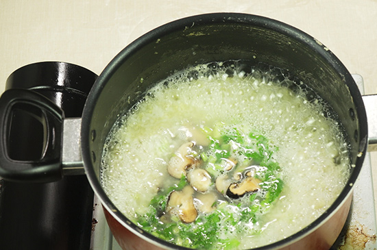 4、最后加入少量黄酒去腥搅拌均匀后,调入适量鸡精提味,美味的蔬菜虾仁粥就做好了。
