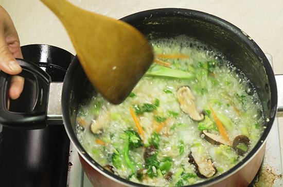 起锅烧水放入小米和米煮十几分钟,期间适当搅拌避免粘锅。再加入切好的芹菜、香菇、西兰花、姜、胡萝卜和虾仁煮至粘稠,期间适当搅拌。最后加入少量黄酒去腥搅拌均匀后,调入适量鸡精提味,美味的蔬菜虾仁粥就完成了。