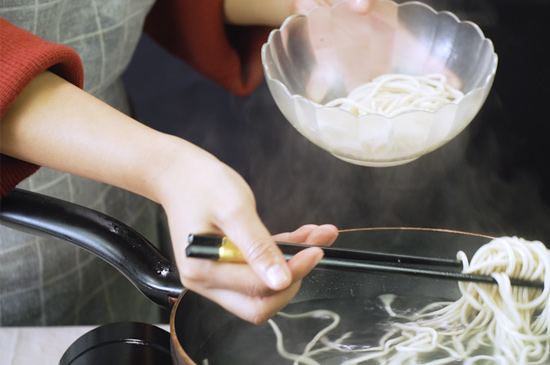 2、起锅烧水,水烧开后放入碱面煮至8成熟关火,再捞出装入碗内备用。