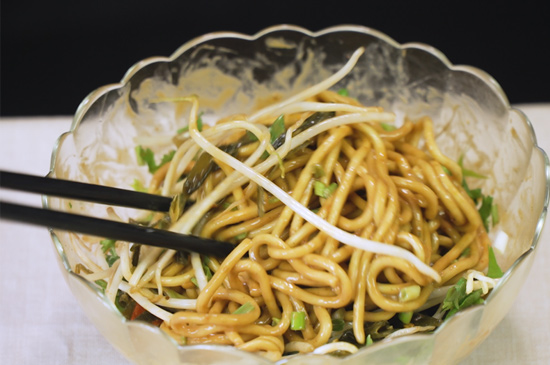 3、往碗内倒入调好的酱汁搅拌均匀,再放入豆芽、葱花、香菜、海带丝搅拌均匀,美味的热干面就做好了。