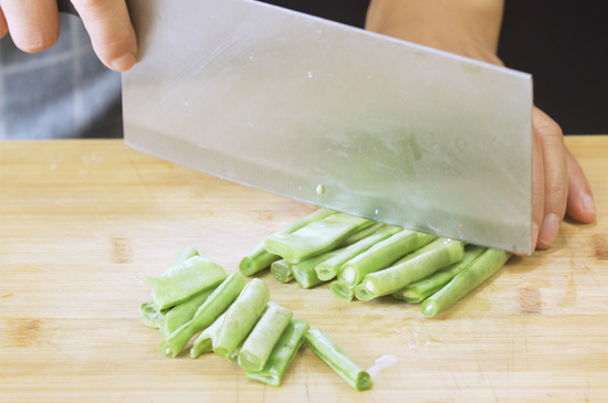 1、豆角摘洗干净切段,肉切丝,蒜切片,大葱葱白斜切成片备用。