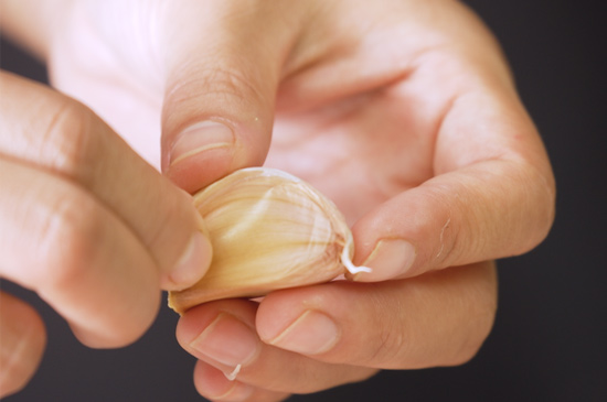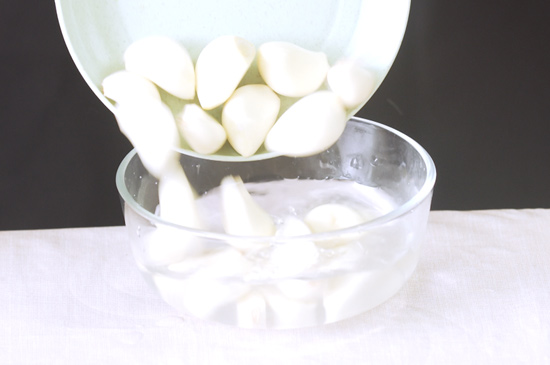 2、盆内倒入水,加盐搅拌均匀后,放入大蒜浸泡2天。