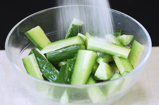 1、黄瓜洗净切长条,再放入盆内加盐掂一掂控水。姜切片,蒜切片备用。
