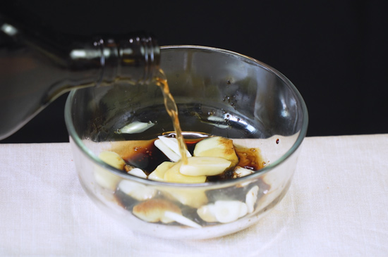 3、酱油、生抽、白糖倒入碗内搅匀至白糖融化,再加入姜片、蒜片、料酒、蚝油、黄瓜和炸好的油。