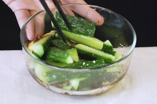 起锅烧油放入花椒炸出香味后,倒入碗内冷却备用。酱油、生抽、白糖倒入碗内搅匀至白糖融化,再加入姜片、蒜片、料酒、蚝油、黄瓜和炸好的油。最后将所有食材搅拌均匀,美味的黄瓜咸菜就完成了。