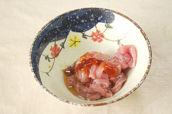 2、里脊肉放入碗内,加入蚝油、料酒拌匀腌制一段时间备用。
