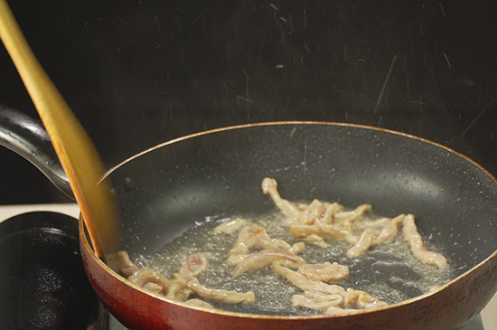 3、起锅烧油,油热后放入肉丝炒至变色盛出备用。