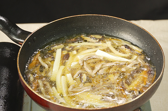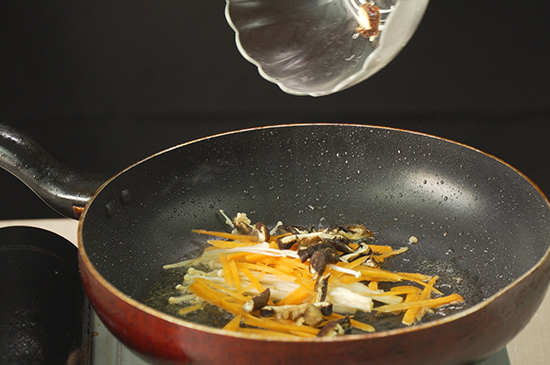 4、往锅内倒入金针菇、胡萝卜丝和香菇丝,用余下的油煸炒片刻,再倒入适量水、生抽大火烧开转小火煮2分钟。