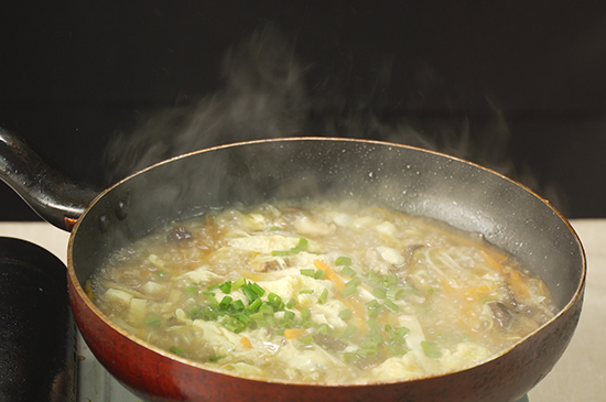 7、最后沿着锅边倒入香醋,撒入胡椒粉推匀,再撒上葱花,美味的酸辣汤就做好了。