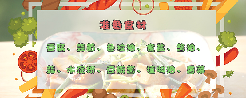 准备食材:豆腐、蒜苗、色拉油、食盐、酱油、蒜、水淀粉、豆瓣酱、植物油、香菜
