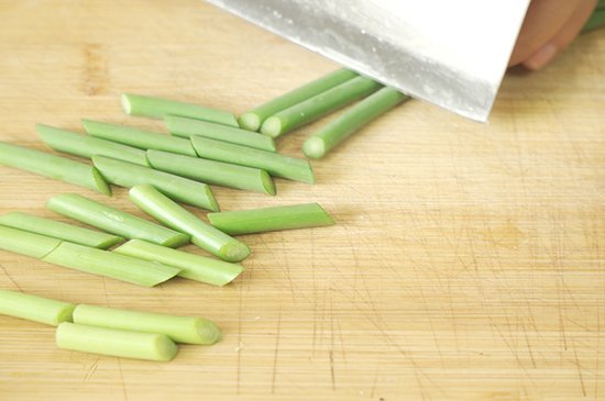4、汤汁快干时,加入蒜苗梗翻炒几次,再倒入水淀粉搅匀。