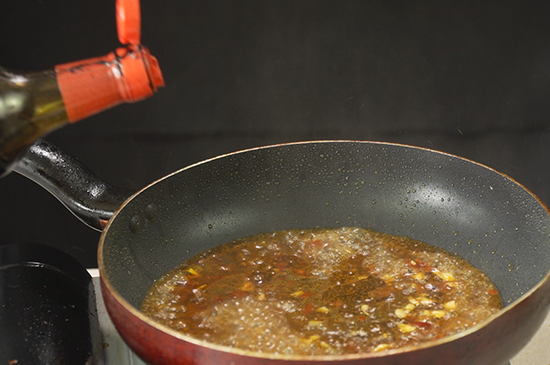 2、起锅烧油,油热后放入豆瓣酱炒出香味,再放入蒜末炒香。