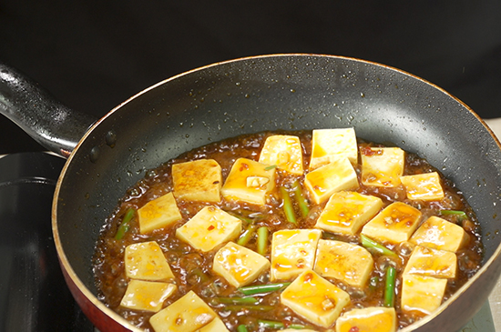 3、加入少量开水,调入酱油和食盐后,倒入豆腐烧至,期间不断推锅使豆腐入味。