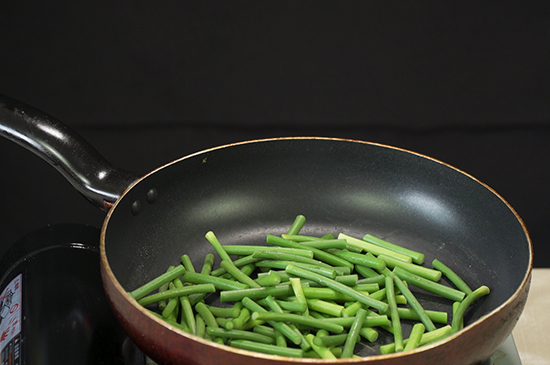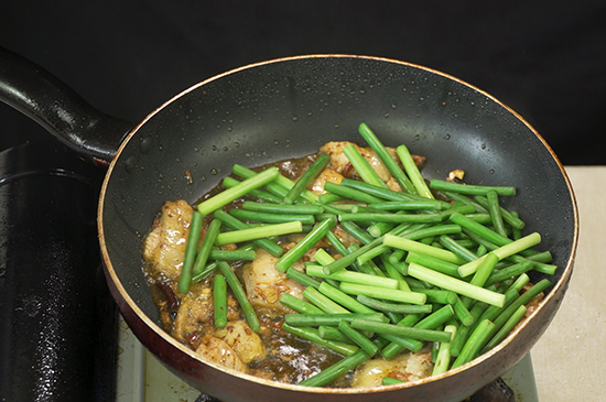 3、起锅不加油放入蒜苗翻炒至表皮微皱、蒜香浓烈后装盘备用。