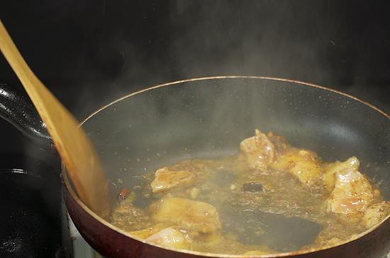 4、起锅烧油,油热后放入蒜蓉辣酱、干辣椒炒出香味,再放入肉片煸炒出油上色。