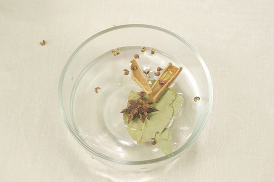 3、香叶、桂皮、花椒、八角、孜然粒等放在水里浸泡10分钟,再沥干水分备用。