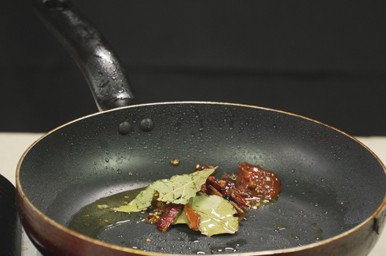 6、往锅内倒入豆豉慢炒,加入泡好的香叶、桂皮、花椒、八角、孜然粒等继续翻炒。