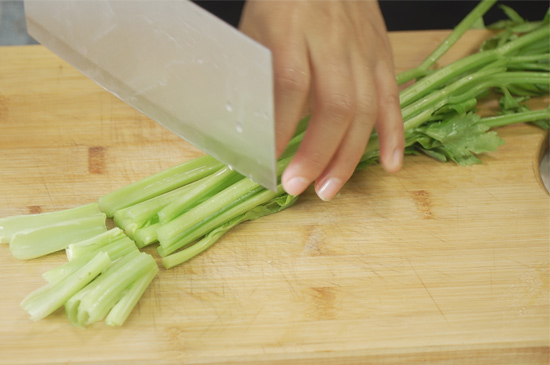 1、芹菜洗净切段,姜切片,大葱取葱白切段,干辣椒切段备用。