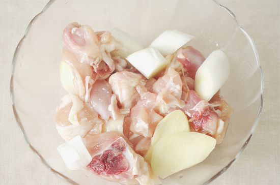 2、鸡洗净剁成小块后,放入盘内加盐、姜片、葱段和料酒和匀腌制10分钟。
