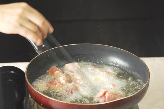 3、起锅烧油,油至六七成热,放入腌好的鸡肉炸干水分后捞出。