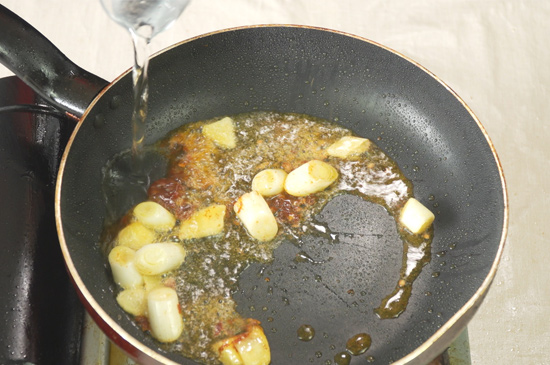 5、另起锅烧油至4成热,倒入豆瓣酱、姜片、葱段煸炒上色后,掺入水和火锅料烧开熬煮几分钟。