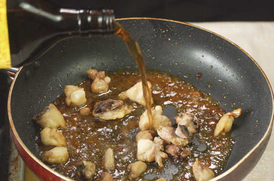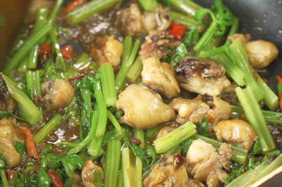 6、捞去料渣,依次倒入鸡块、料酒、豆鼓、干辣椒、花椒芹菜、白糖、鸡精、味精、香油翻炒均匀。