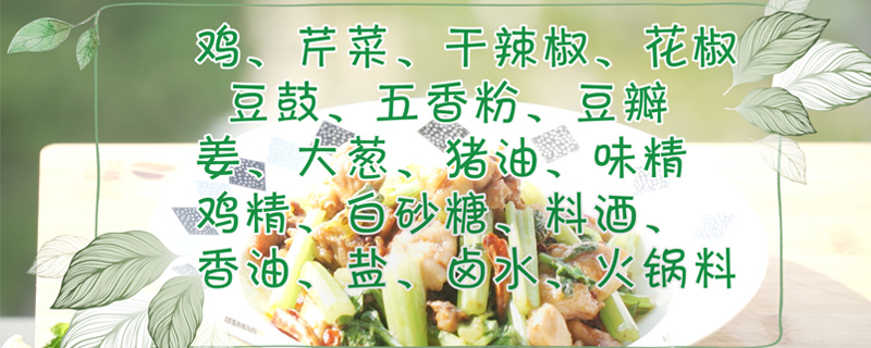准备食材:鸡、芹菜、干辣椒、花椒、豆鼓、五香粉、豆瓣、姜、大葱、猪油、味精、鸡精、白砂糖、料酒、香油、盐、卤水、火锅料。