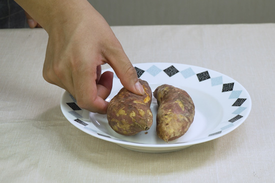 3、红薯放在微波炉的托盘上,用高火加热3分钟,翻个面,继续用高火加热三分钟,根据红薯的大小调整时间,捏着软软的就是烤熟了,可以取出食用了。