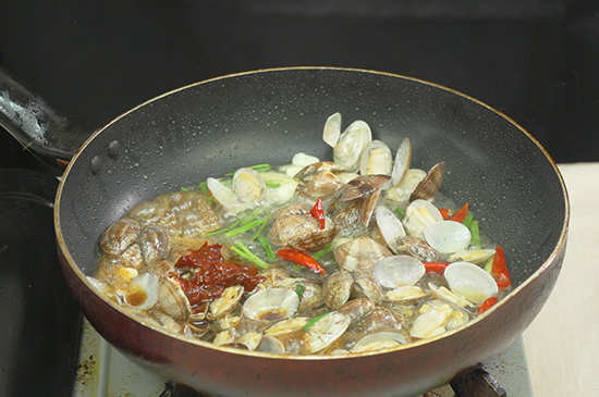 食材清洗干净后,把刷洗干净的花甲在锅中过水焯一下,开壳后捞出,爆香葱、姜、蒜后把花甲倒入锅中翻炒,加入适量的料酒、豆瓣酱等调料,翻炒均匀后撒上香菜就可以关火出锅了。