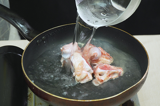 1、猪腿骨块用清水冲洗干净,放入锅内加水烧开煮10分钟以上,煮出血水后捞出用温水洗净后,沥干水分备用。