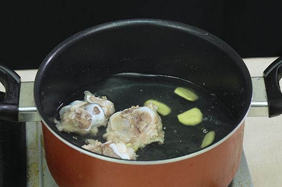 2、大骨放入砂锅内,加入水、姜片、八角大火烧开转小火煲制1.5小时。