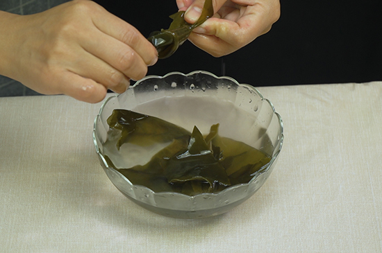 3、同时将海带打开,清水洗干净后,放入水中重新打结备用。