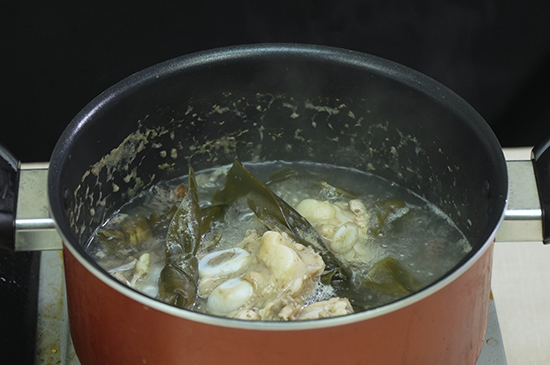4、最后将海带放入煮好的骨头汤内继续煲30分钟以上,海带煲至滑烂后,调入适量盐和味精,美味的海带结大骨头汤就做好了。