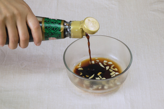 3、往锅内加入蒜末、白醋、生抽、酱油、蒸鱼鼓油、鸡精、白糖和盐调成料汁。