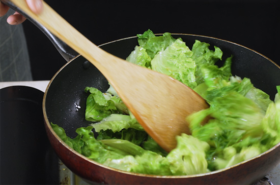 4、最后放入生菜,滴入少量芝麻油翻炒均匀,美味的呛生菜就做好了。